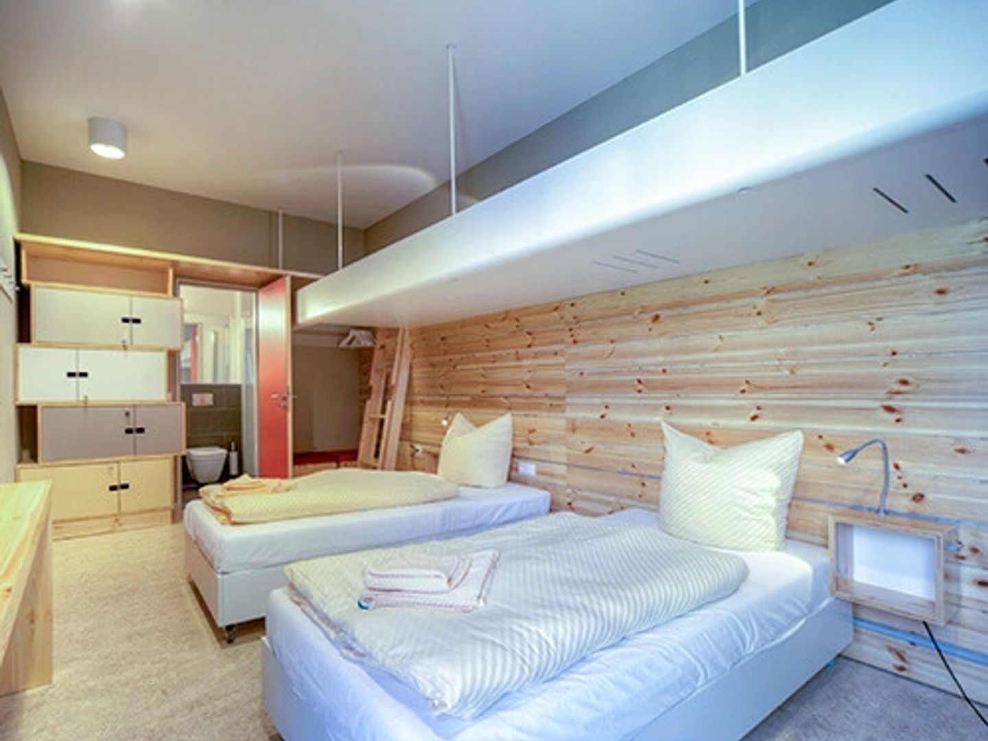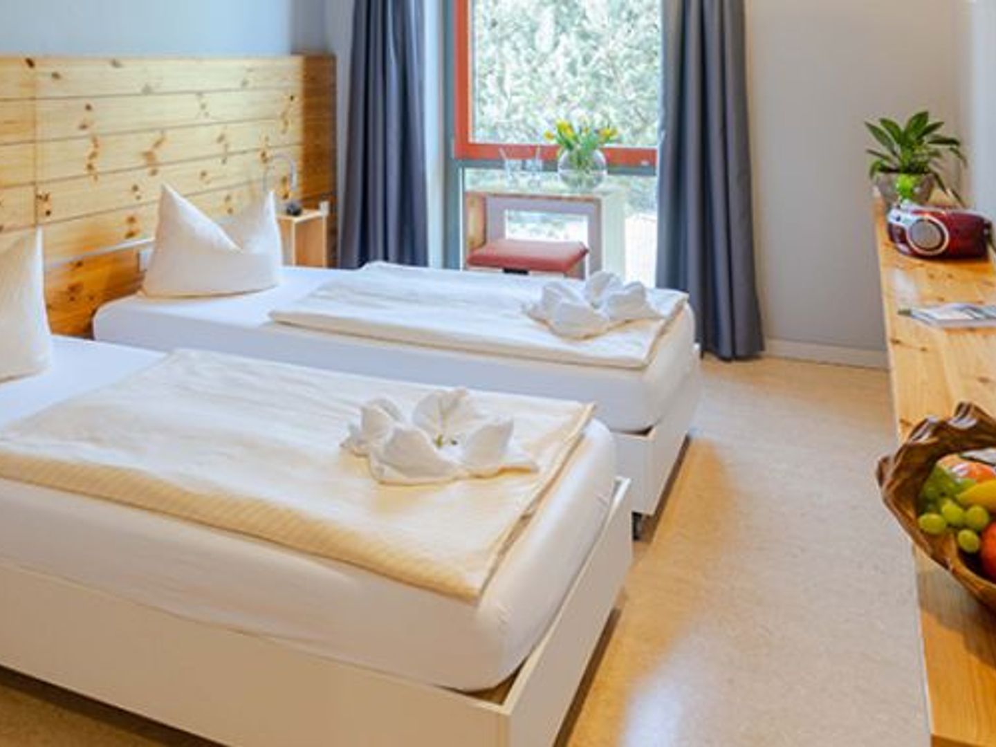 Die beiden Einzelbetten sind flexibel stellbar und lassen sich im Handumdrehen zu einem Doppelbett zusammenschieben. So eignet sich das Zimmer für Paare, Freunde, Alleinreisende oder Gäste, die einfach flexibel bleiben möchten.