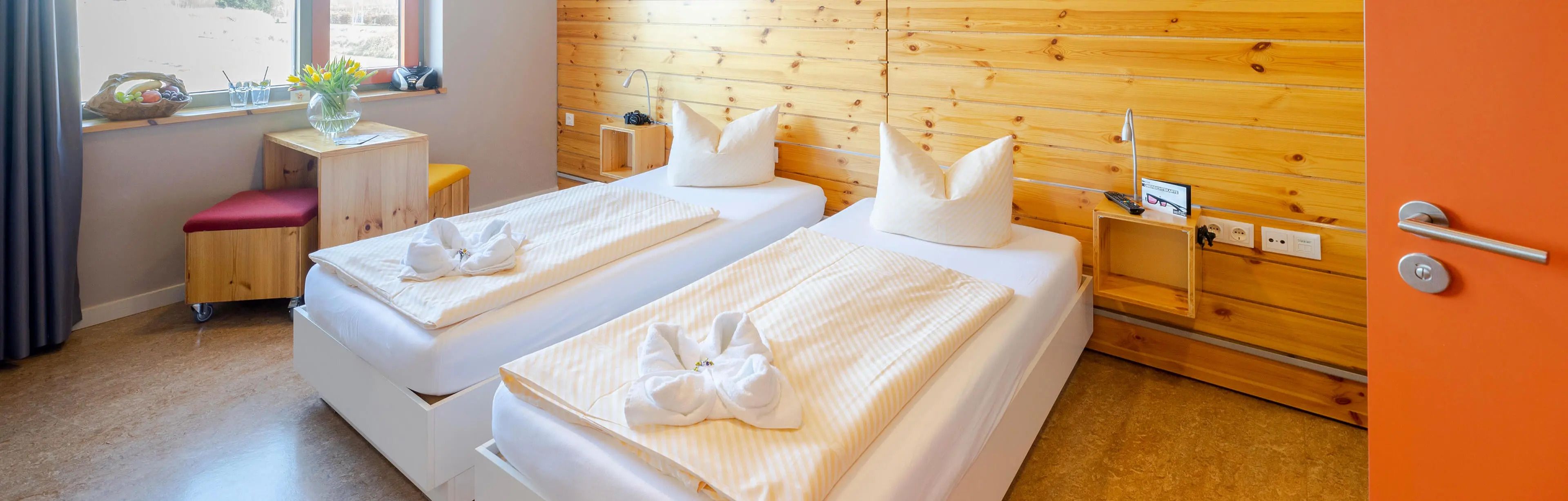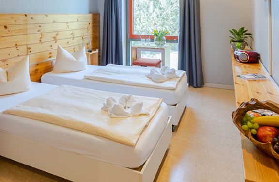 Zweibettzimmer mit getrennten Betten, die sich ganz einfach zum Doppelbett zusammenschieben lassen.