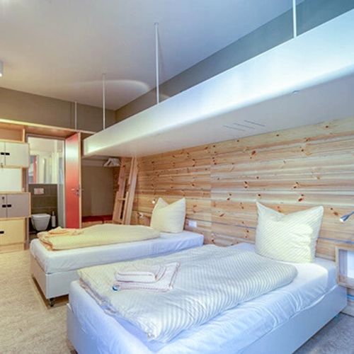 Unsere Vierbettzimmer verfügen neben 2 Einzelbetten über ein schwebendes Hochbett für 1 - 2 Personen.